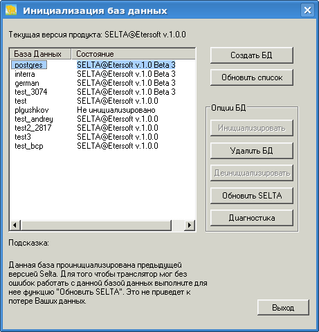Если вы правильно указали имя сервера с СУБД, имя пользователя (владельца баз) и пароль, то откроется окно утилиты Инициализации Баз данных: